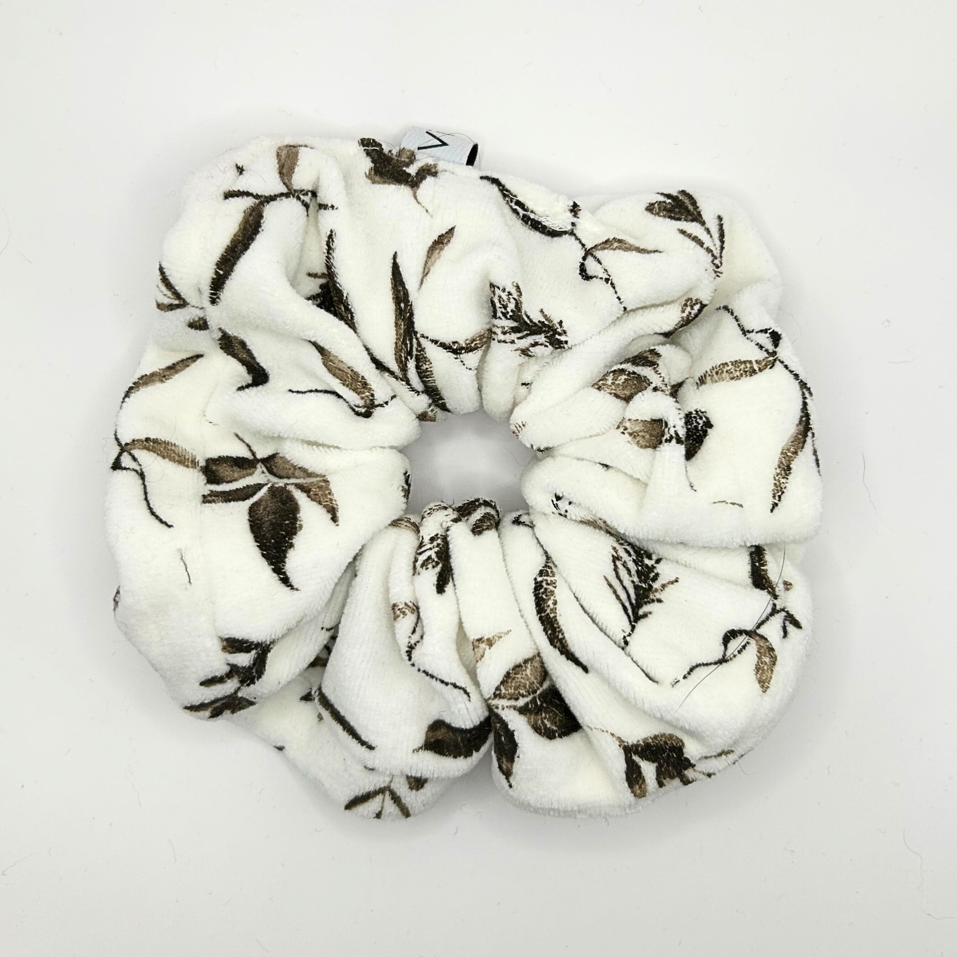 Dit is een handmade scrunchie in de kleur Hannah. Een zachte witte stof met bladmotief.