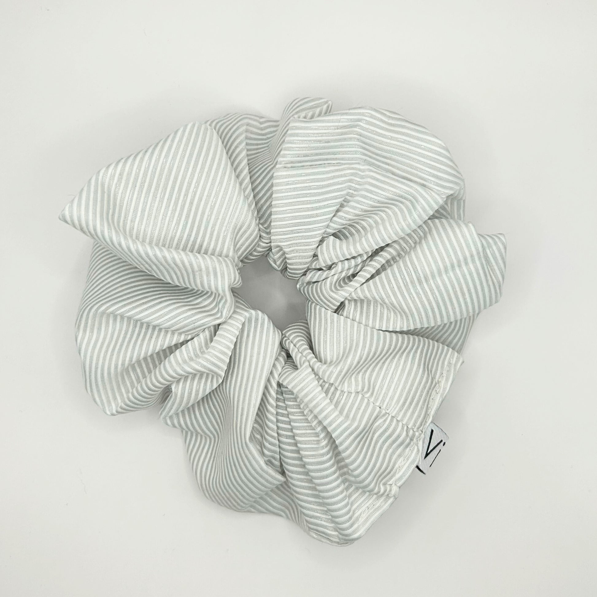 Dit is een handmade scrunchie in de kleur Nancy. Een gestreepte witte stof